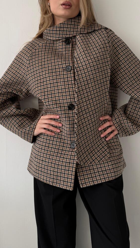 Plaid Patterned Jacket w/ Fixed Scarf